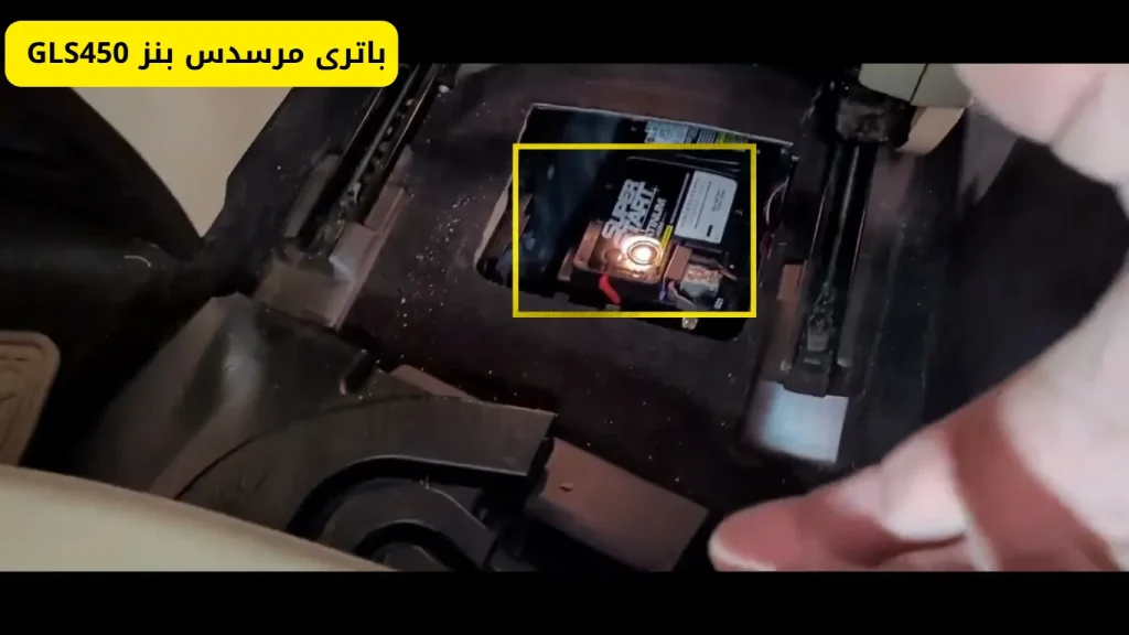 باتری اصلی بنز GLS450 در قسمت کابین و زیر صندلی کمک راننده قرار دارد. در تصویر زیر میتوانید محل قرارگیری باتری در بنز GLS450 مشاهد کنید: