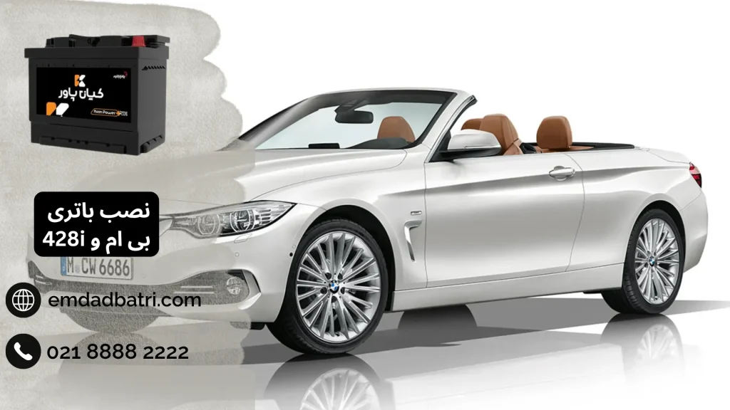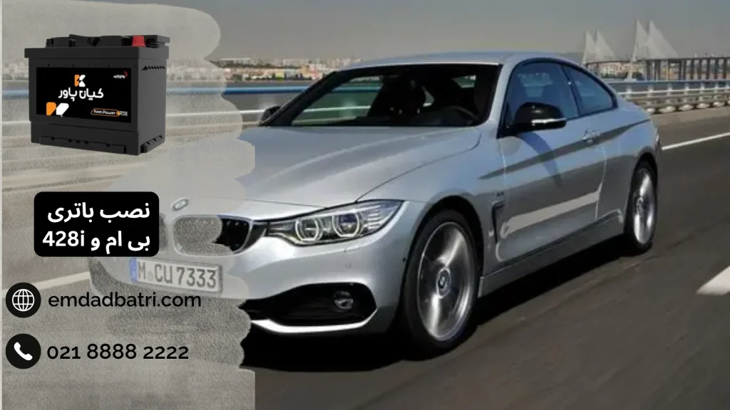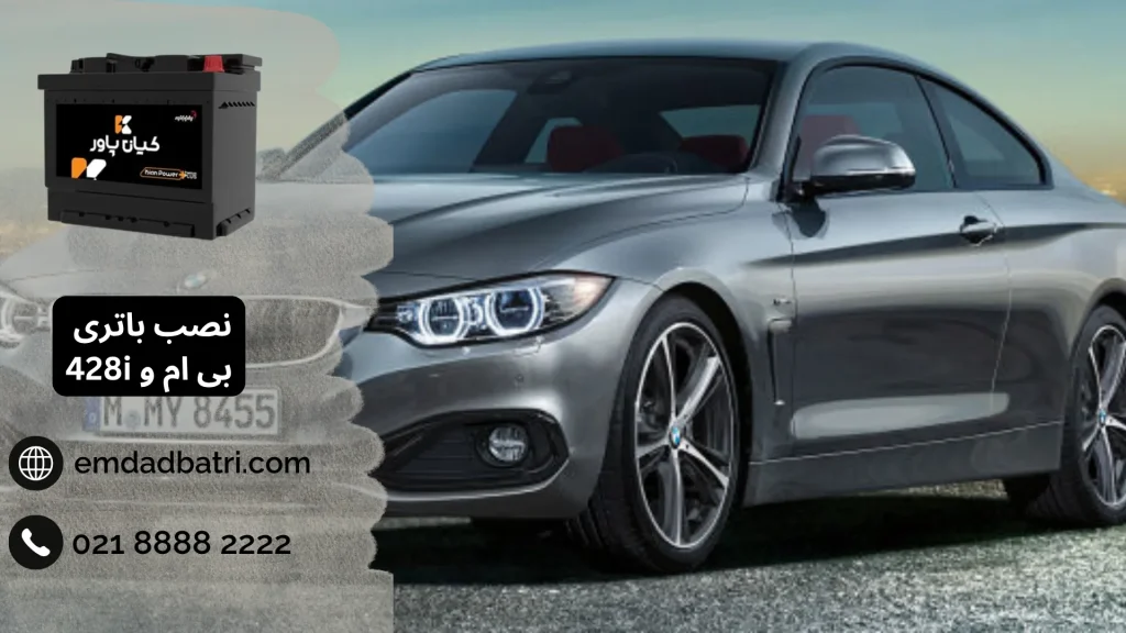 باتری استاندارد خودرو بی ام و 428i دارای ظرفیت 80 آمپر (AH) ساعت و ولتاژ 12 ولت (V) است. این باتری با قالب L4 (قطب چپ و پایه کوتاه) بر روی این خودرو نصب میشود. به عنوان باتری جایگزین میتوانید باتری 100 آمپر ساعت با قالب L5 را بر روی این خودرو نصب کنید. باتری بی ام و 428i، در صندوق عقب خودرو، در قسمت گلگیر سمت شاگرد نصب شده است.