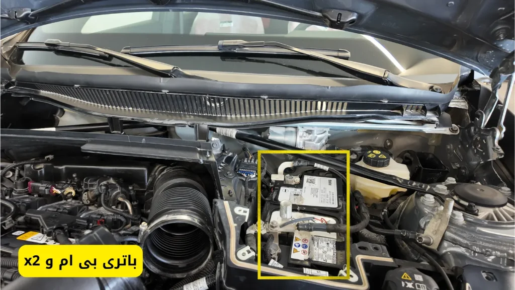 محل قرارگیری باتری بی ام و x2 در قسمت پیشرانه (کاپوت جلو) میباشد. در تصویر زیر میتوانید مشاهده کنید: