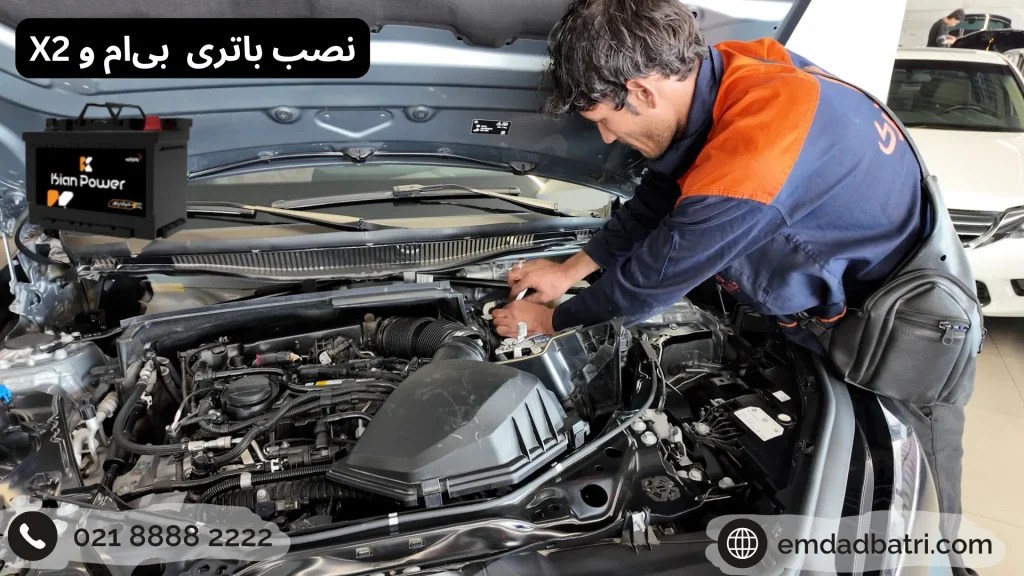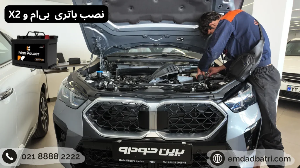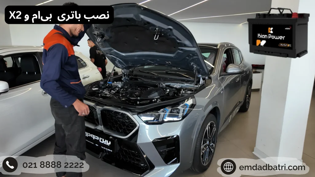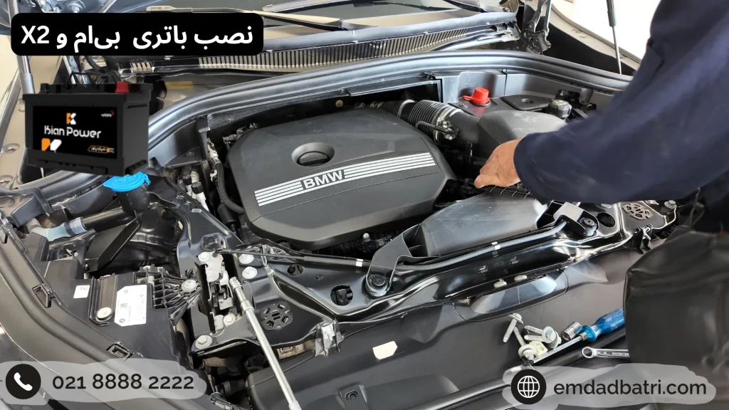 محل قرارگیری باتری بی ام و x2 در قسمت پیشرانه (کاپوت جلو) میباشد. در تصویر زیر میتوانید مشاهده کنید: