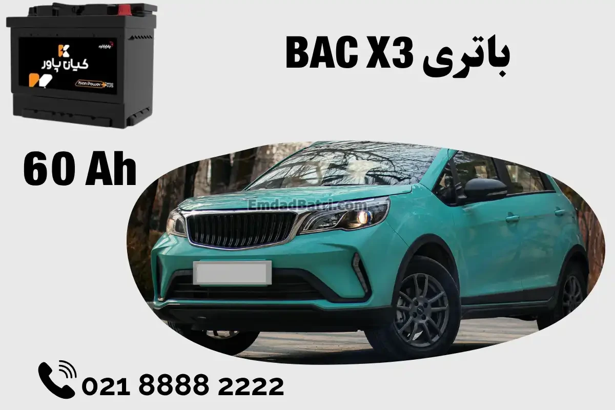 بیایسی ایکس 3 پرو (BAC X3 PRO) یک خودروی کراس اوور کامپکت با طراحی جذاب، عملکرد قابل قبول و امکانات رفاهی و ایمنی مناسب است. این خودرو برای افرادی که به دنبال یک خودروی خانوادگی با قیمت مناسب هستند، گزینه خوبی است. خودروی بی ای سی ایکس 3 پرو، که به صورت گذر موقت در ایران تردد می کند، مجهز به باتری 12 ولت با ظرفیت 60 آمپر و قالب L2 است. ابعاد دقیق این باتری 24.2 در 17.5 در 19 سانتیمتر میباشد. محل نصب باتری استارتر این خودرو در قسمت جلویی کاپوت قرار دارد. ما در مجموعه خود، خدمات تخصصی مشاوره و تعویض باتری برای خودروی بی ای سی ایکس 3 پرو را ارائه می دهیم. در صورتی که نیاز به مشاوره یا تعویض باتری خودروی خود دارید، می توانید به ما مراجعه نمایید تا از خدمات تخصصی ما بهرهمند شوید.