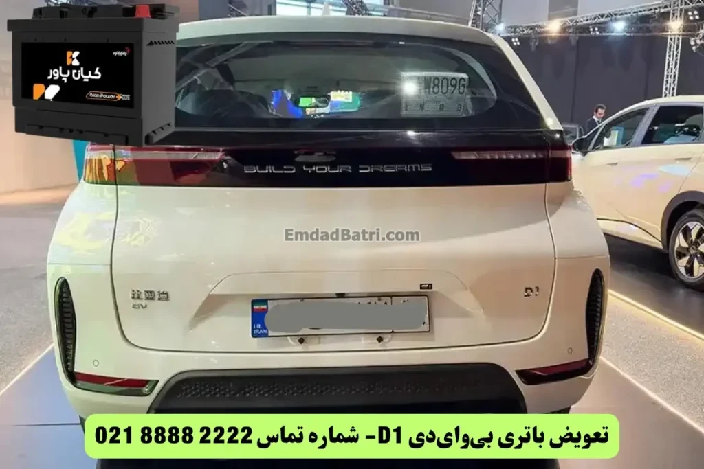 باتری استاندارد خودرو بی وای دی D1 دارای ظرفیت 50 آمپر (AH) ساعت و ولتاژ 12 ولت (V) است. این باتری با قالب L1 (قطب چپ و پایه کوتاه) بر روی این خودرو نصب میشود. به عنوان باتری جایگزین و قوی تر، میتوانید باتری 55 و 60 آمپر با قالب L2 نیز بر روی این خودرو نصب کنید. باتری بی وای دی D1 در محفظه موتور نصب شده است.