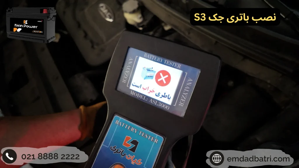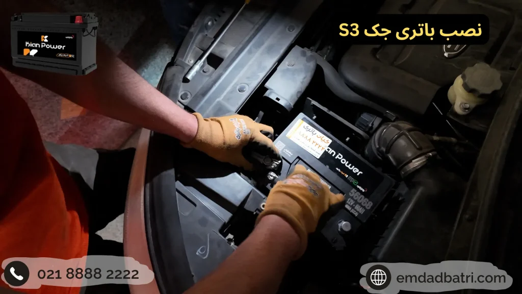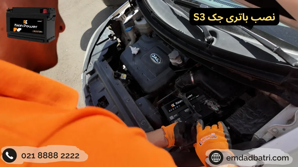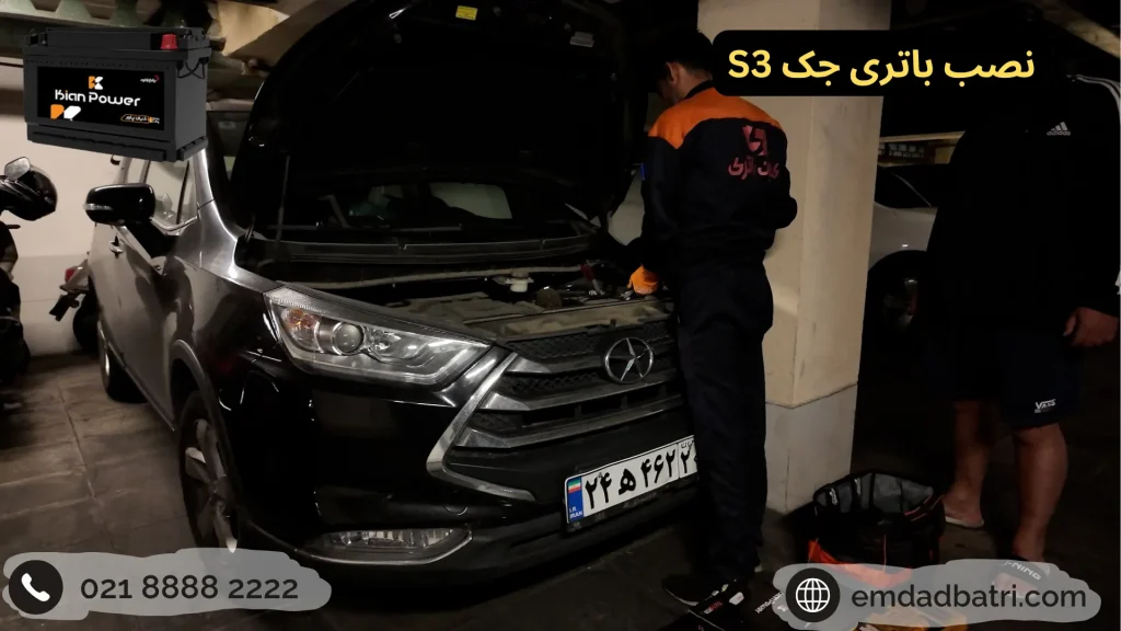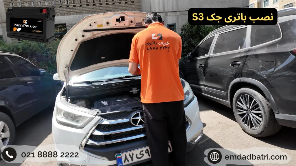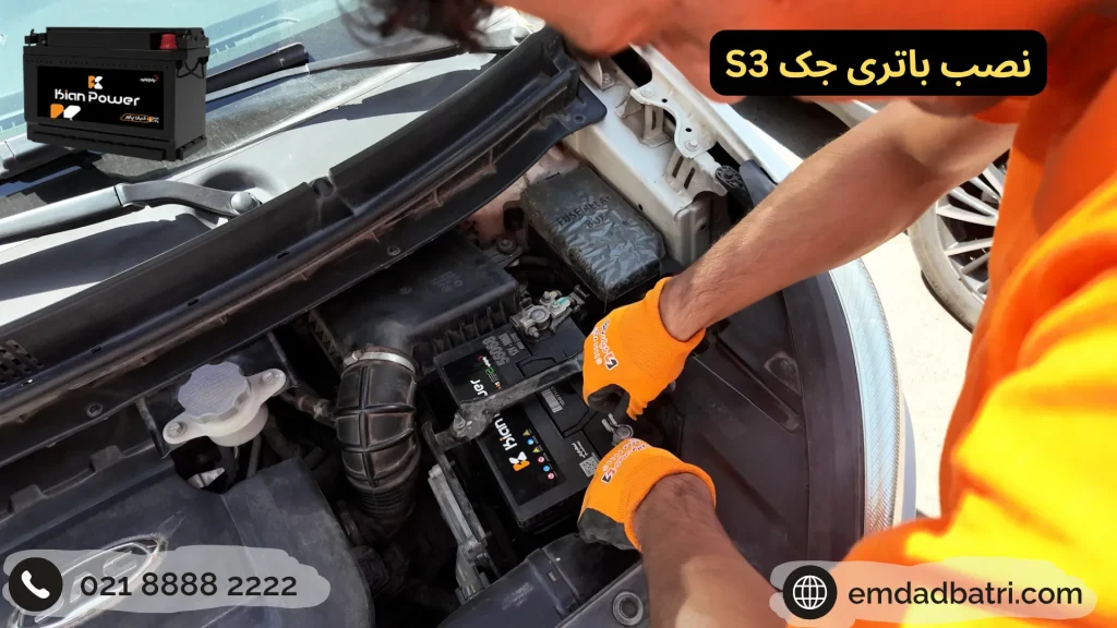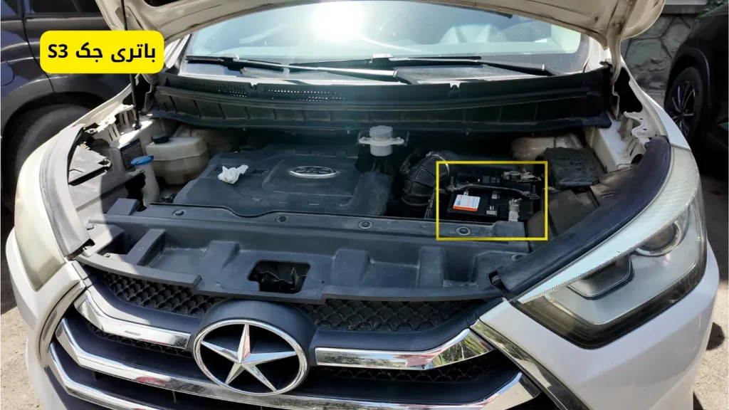 باتری این خودرو در قسمت پیشرانه (کاپوت جلو) قرار دارد. در تصویر زیر میتوانید محل نصب باتری جک s3 را مشاهده نمایید: