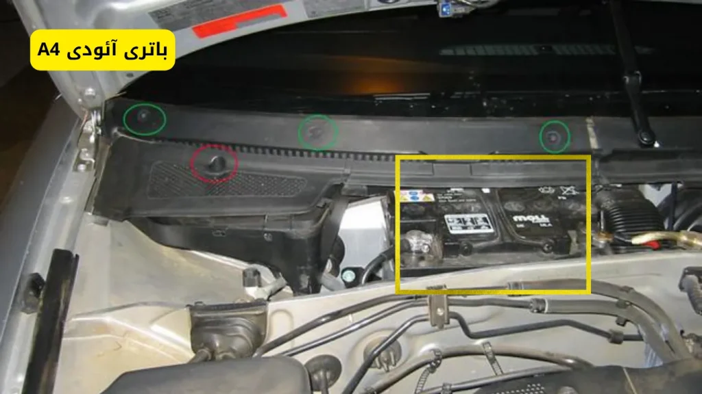 باتری این خودرو در قسمت پیشرانه (کاپوت جلو) قرار دارد. در تصویر زیر میتوانید محل قرارگیری باتری این ماشین را مشاهده کنید: