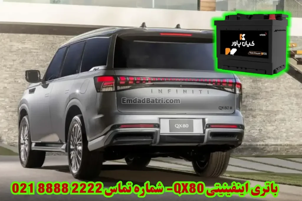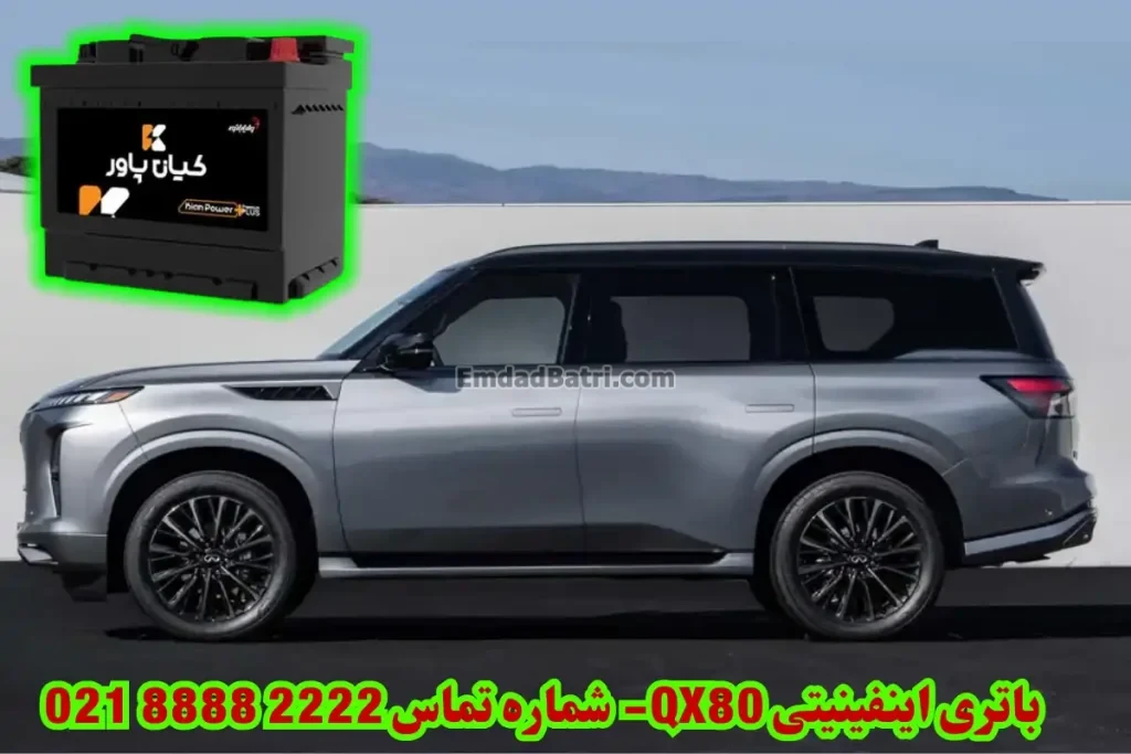 باتری مناسب برای خودروی اینفینیتی کیو ایکس 80، Infiniti QX80 یک باتری 90 آمپر با قالب D31، پایه بلند و قطب راست است. این باتری به عنوان منبع تغذیه اصلی برای سیستم استارت خودرو، تجهیزات الکترونیکی، چراغ‌ها و تمام امکانات رفاهی و ایمنی مورد استفاده قرار می‌گیرد. این خودرو فاقد باتری جایگزین است و فقط باتری اصلی معرفی شده برای آن مناسب است.
