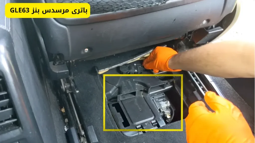 باتری خودرو GLE63 داخل کابین و در زیر صندلی کمک راننده قرار دارد. در تصویر زیر میتوانید محل نصب باتری این ماشین را مشاهده نمایید: