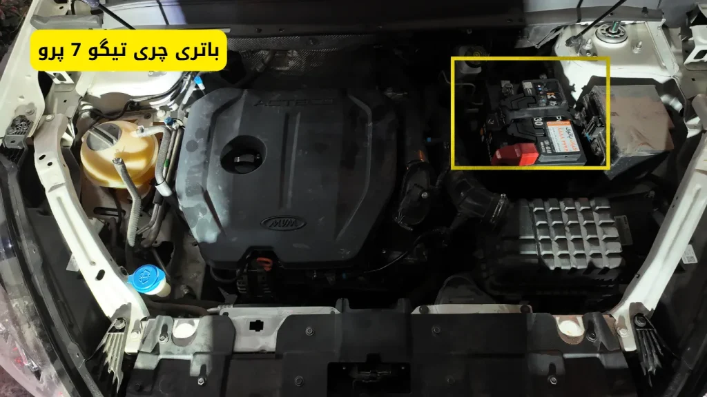 باتری این خودرو در قسمت پیشرانه (کاپوت جلو) قرار دارد. در تصویر زیر میتوانید محل نصب باتری این خودرو را مشاهده نمایید: