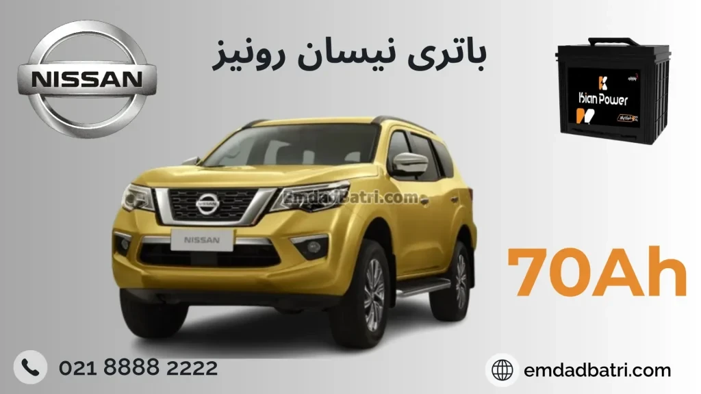 مشخصات باتری فابریک نیسان رونیز: 70 آمپر 12 ولت پایه بلند قطب راست – قالب D26 مشخصات باتری جایگزین: نداردتوصیه کلی : اگر سیستم اضافی مثل ساب و آمپلی فایر روی خودروی خود نصب کرده اید و یا دوست دارید ذخیره انرژی بیشتری داشته باشید می توانید از باتری های جایگزین سفارش بدهید. قیمت باتری