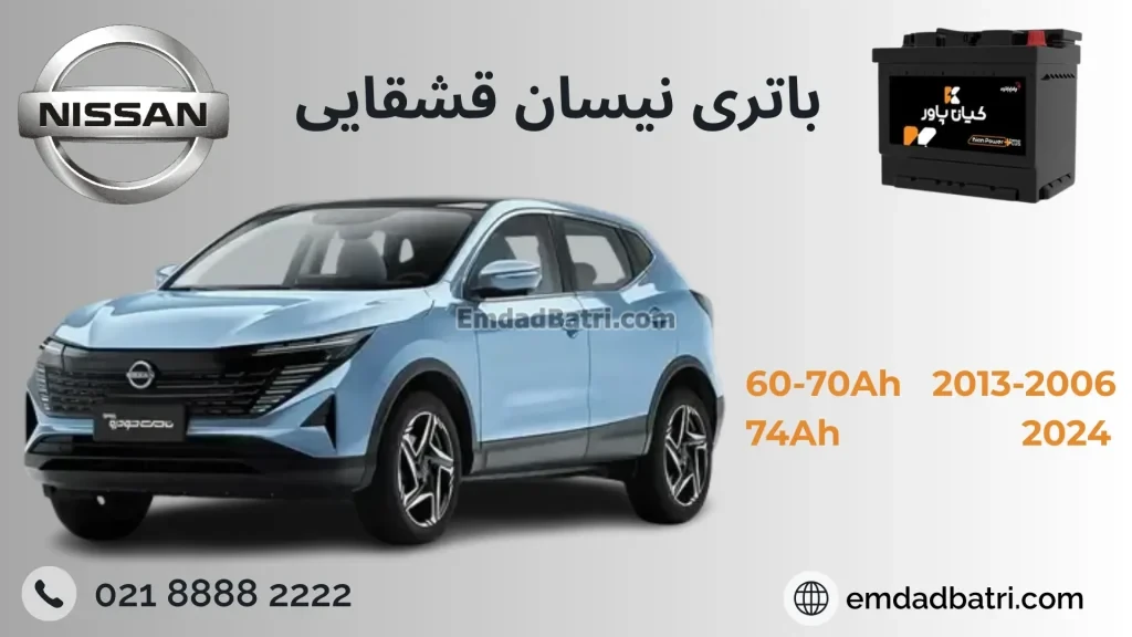 مشخصات باتری فابریک نیسان قشقایی 2013-2006: 60 آمپر 12 ولت پایه بلندقطب چپ – قالب D23 مشخصات باتری جایگزین: 70 آمپر 12 ولت پایه بلندقطب چپ – قالب D23 مشخصات باتری فابریک نیسان قشقایی 2024: 74 آمپر 12 ولت پایه کوتاهقطب چپ – قالب L3 توصیه کلی : اگر سیستم اضافی مثل ساب و آمپلی