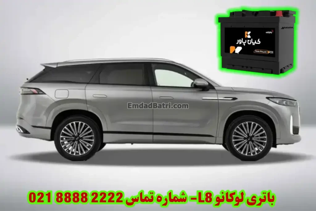 باتری استاندارد خودرو لوکانو L8 دارای ظرفیت 70 آمپر (AH) ساعت و ولتاژ 12 ولت (V) است. این باتری با قالب L3 (قطب چپ و پایه کوتاه) بر روی این خودرو نصب میشود. به عنوان باتری جایگزین میتوانید باتری 74 آمپر ساعت با همان قالب را (L3) بر روی این خودرو نصب کنید. باتری لوکانو L8، در محفظه موتور نصب شده است.
