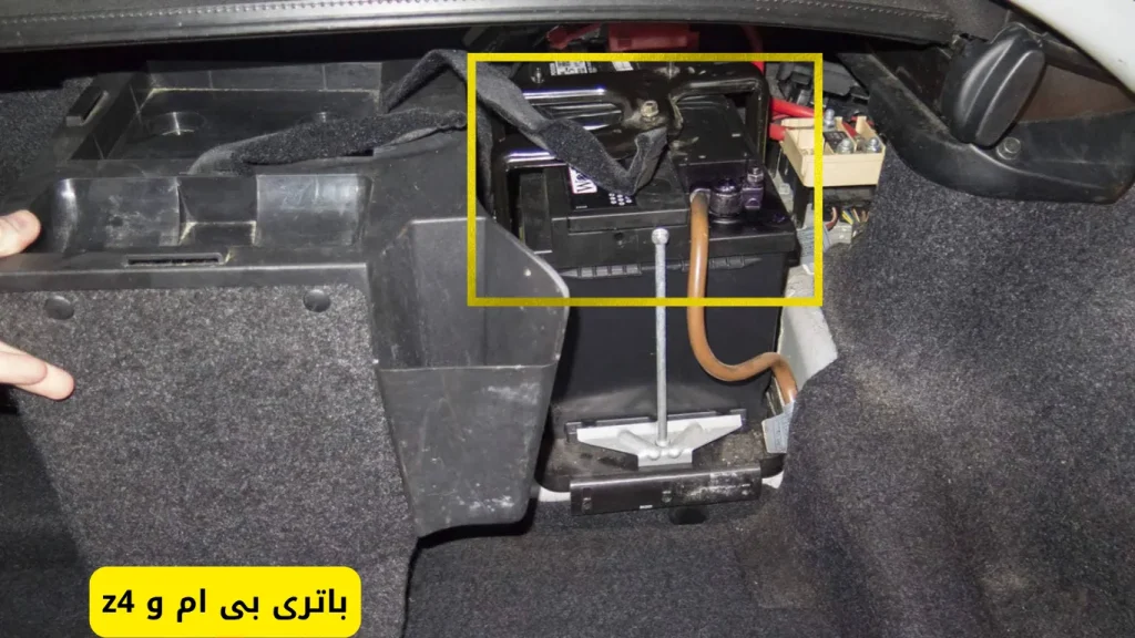 باتری خودرو بی ام و Z4 در کف صندوق عقب قرار دارد. در تصویر رو به رو میتوانید مکان آن را مشاهده نمایید:
