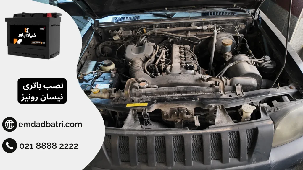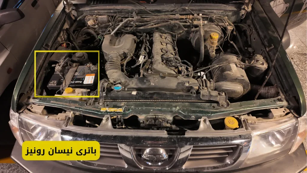 باتری نیسان رونیز در قسمت پیشرانه (کاپوت جلو) قرار دارد. در تصویر زیر میتوانید محل نصب و قرارگیری باتری این خودرو را مشاهده نمایید: