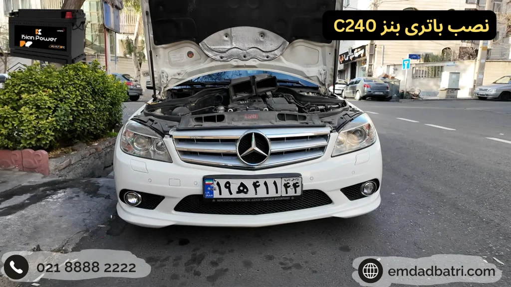 باتری مرسدس C240 در صندوق عقب خودرو و در محفظه موتور نصب شده است. طراحی این بخش به گونه‌ای است که باتری از رطوبت، گرما و لرزش مستقیم در امان باشد و دسترسی برای سرویس و تعویض آن نیز به‌راحتی انجام شود.