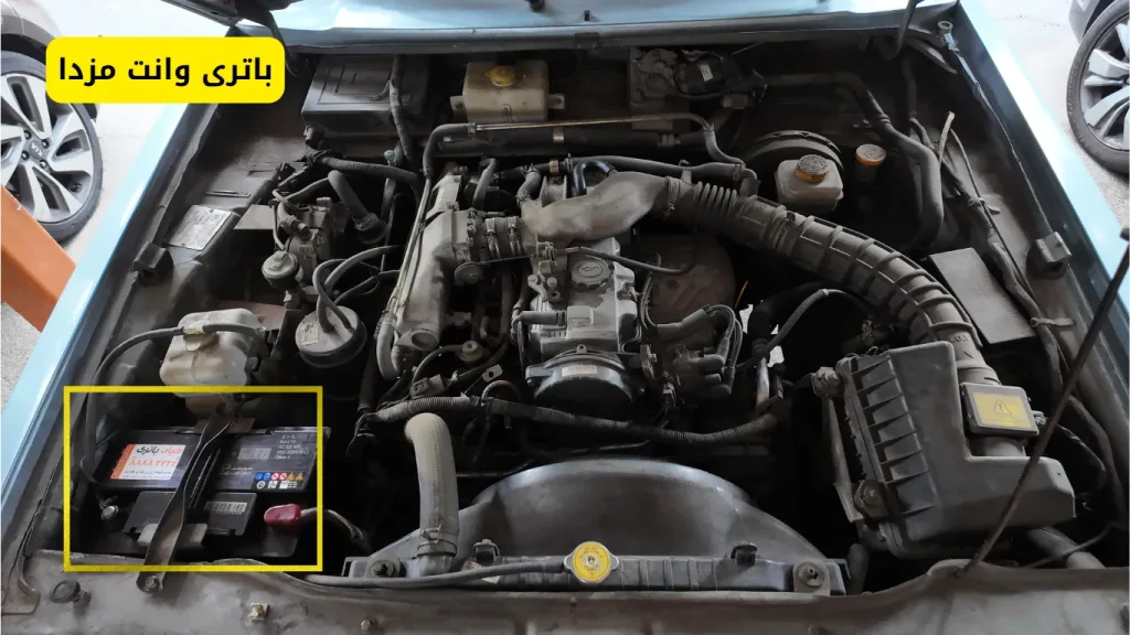 باتری وانت مزدا در قسمت پیشرانه (کاپوت جلو) قرار دارد. در تصویری که در ادامه نمایش داده میشود میتوانید محل نصب باتری خودرو وانت مزدا را مشاهده نمایید: