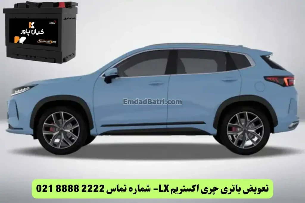 باتری استاندارد چری اکستریم LX دارای ظرفیت 70 آمپر (AH) ساعت و ولتاژ 12 ولت (V) است. این باتری با قالب L3 (قطب چپ و پایه کوتاه) بر روی این خودرو نصب میشود. به عنوان باتری جایگزین، میتوانید باتری 74 آمپر را با همان قالب (L3) بر روی این خودرو نصب کنید. باتری چری اکستریم LX، در محفظه موتور خودرو نصب شده است.