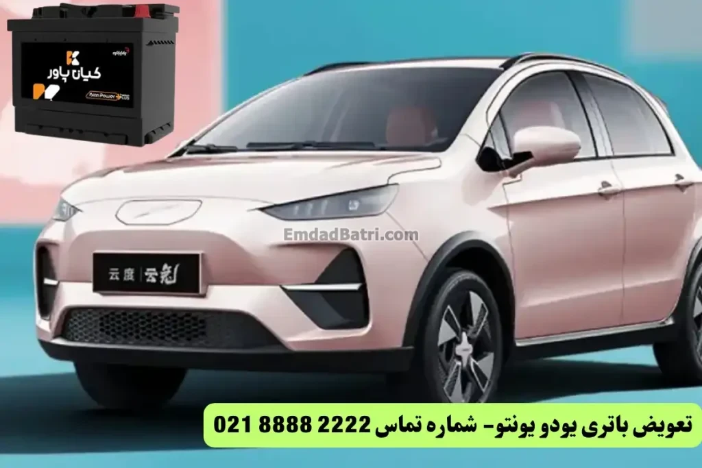 باتری استاندارد خودرو یودو یونتو دارای ظرفیت 60 آمپر (AH) ساعت و ولتاژ 12 ولت (V) است. این باتری با قالب D23 (قطب چپ و پایه بلند) بر روی این خودرو نصب میشود. باتری یودو یونتو، در محفظه موتور نصب شده است.