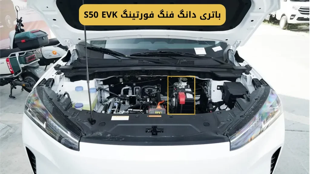 همانطور که در شکل زیر مشاهده میکنید، باتری ماشین دانگ فنگ فورتینگ S50 EVK در محفظه موتور نصب میشود.