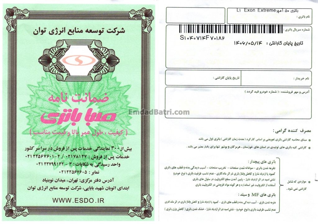 - گارانتی معتبر: دارای گارانتی 21 ماهه معتبر و قابل استعلام، نحت پوشش شرکت صبا باتری.