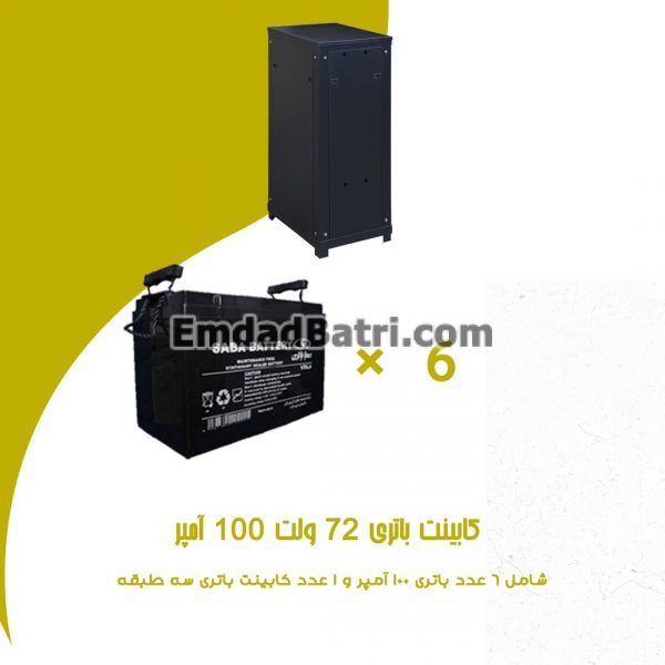 کابینت باتری 72 ولت 100 آمپر شامل شش باتری 100 آمپر و یک رک باتری سه طبقه است.
