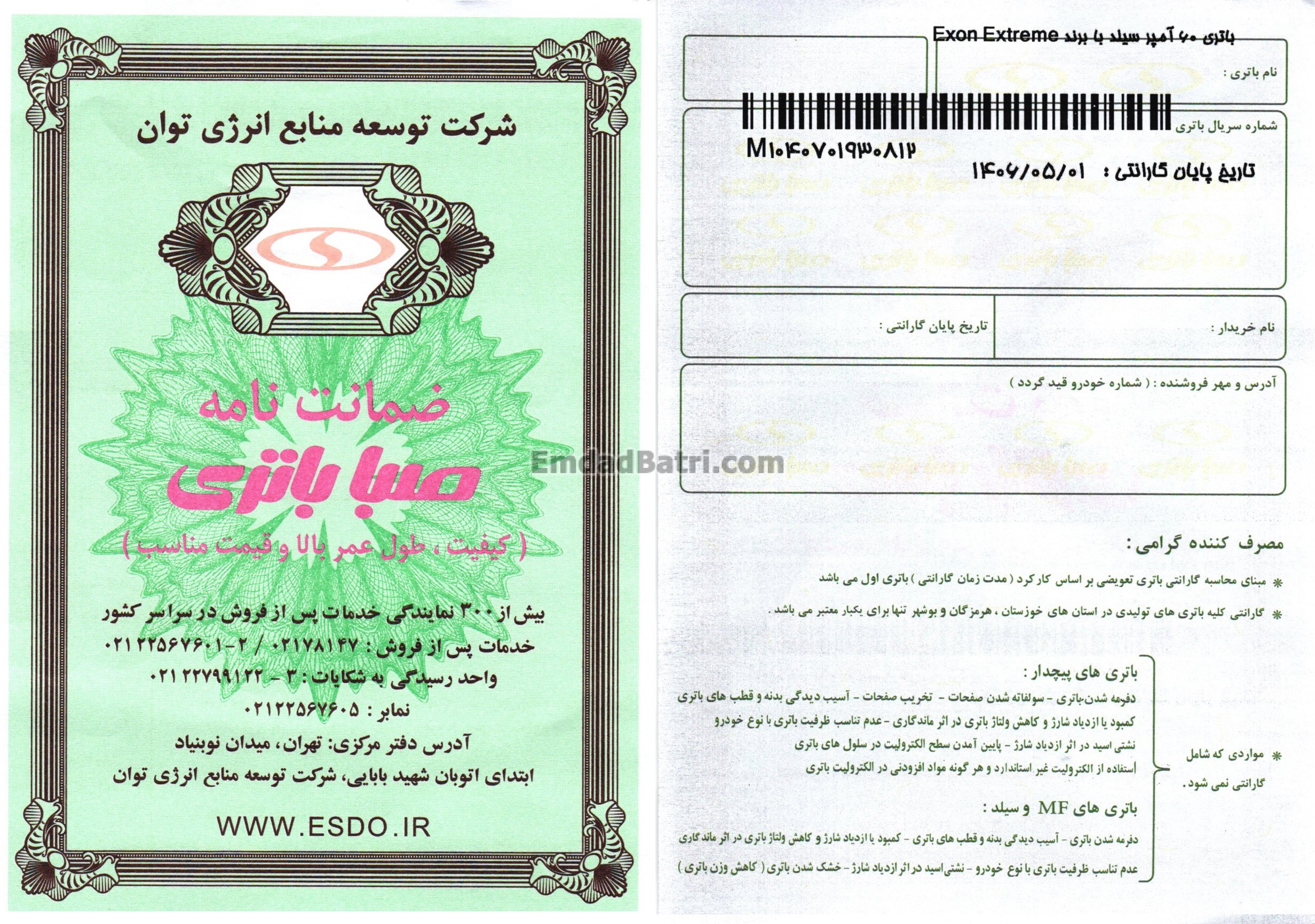 باتریهای 60 آمپر اکسون با گارانتی 21 ماهه عرضه میشوند که شامل خدمات تعویض و پشتیبانی سراسری است. این گارانتی نیازی به فعالسازی ندارد و برگه آن همراه با باتری تحویل مشتری داده میشود.
